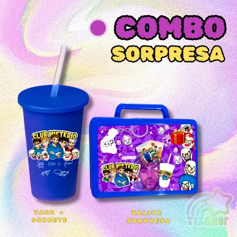 Llego el combo mas esperado y completo para fans del club misterio y Fede Vigevani Razones para adquirir este combo: Info Vasos: Vaso fuerte 50% transparente con tapa y sorbete con las firmas de los integrantes del club misterio contiene un sorbete transparente de Perfecto y cómodo tamaño para grandes y chicos. tapa a presión que te permite proteger tu bebida a donde vayas . 2 colores a elección. info valija: valija de plástico reforzada perfecta para guardar cositas x en ella y protegerlas con su seguro. decorada con el estilo club misterio y sus firmas contiene un llavero de peluche suave que puedes ponerlo hasta en tu mochila.(se puede lavar varias veces) contiene stickers de fede para pegarlos en donde quieras. contiene foto Cards de Fede y el club misterio (pensadas en coleccionarlas ) contiene un regalo sorpresa con la temática que para descubrirlo debes adquirir este producto en combo